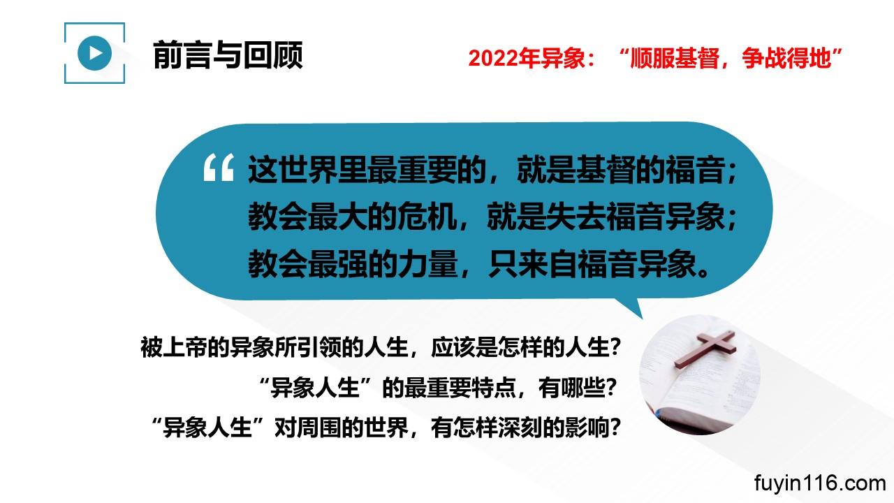 “顺 服 基 督,争 战 得 地”,是主赐给我们2022年的异象。