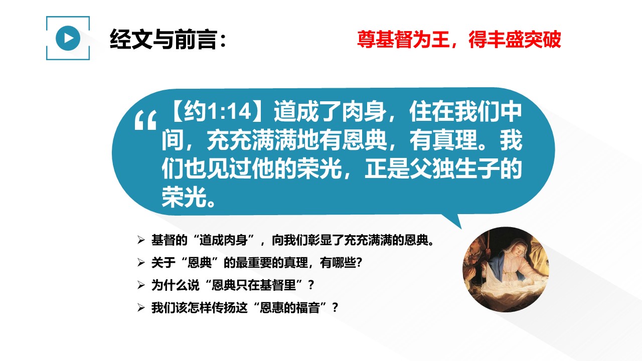 基督的“道成肉身”,向我们彰显了充充满满的恩典。