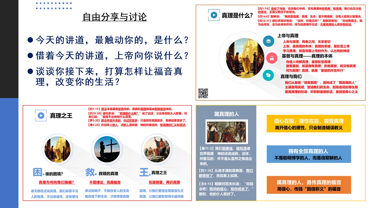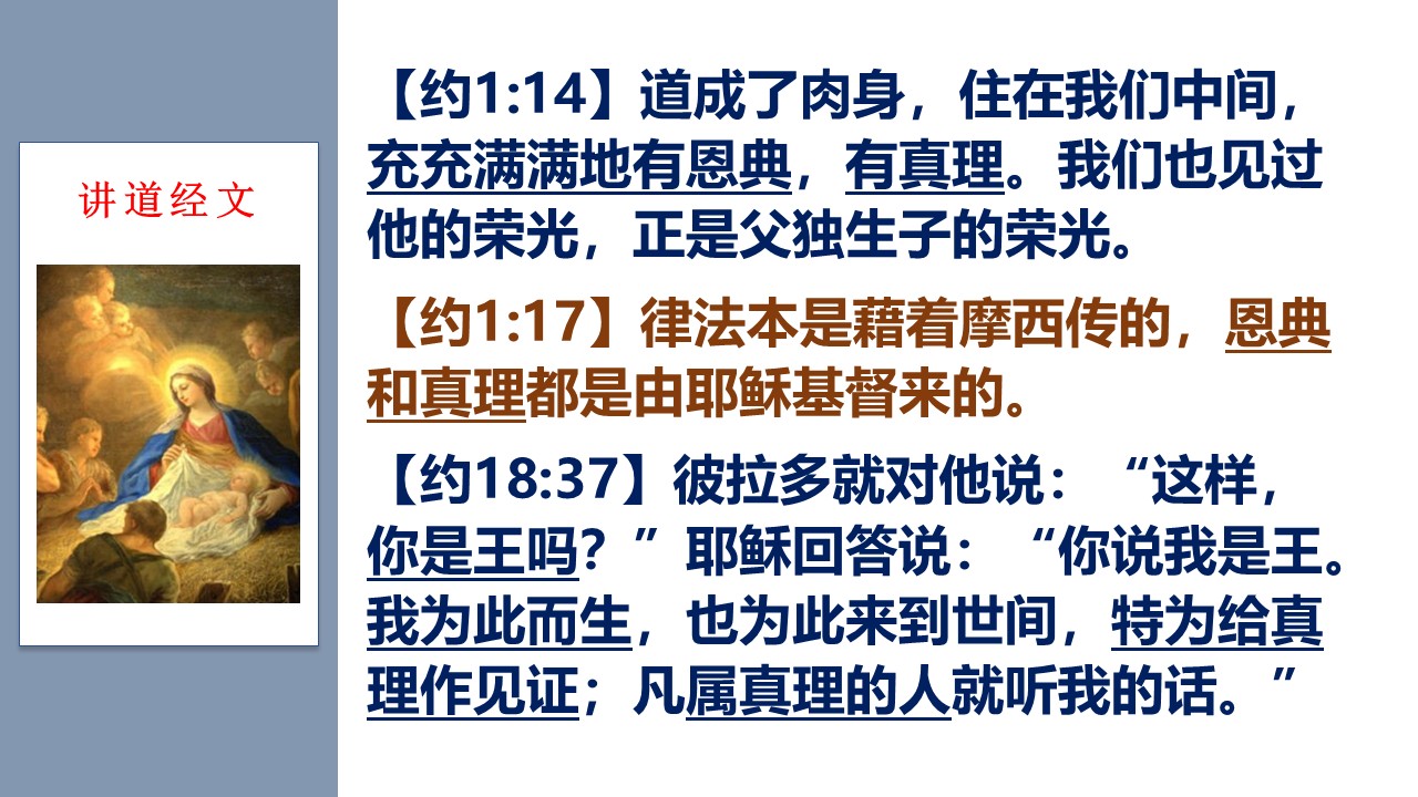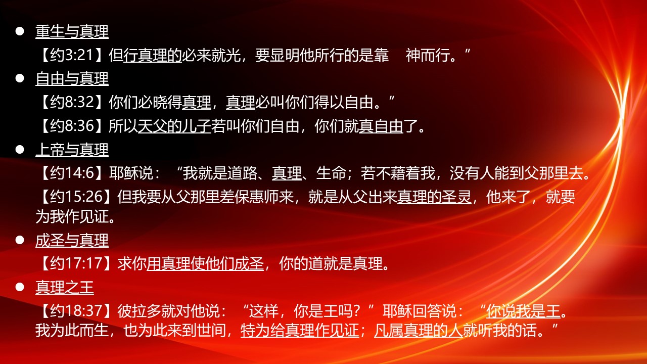 “道成肉身”的基督,称为“充充满满地有恩典,有真理”,主基督的话语里,也多次提及真理。