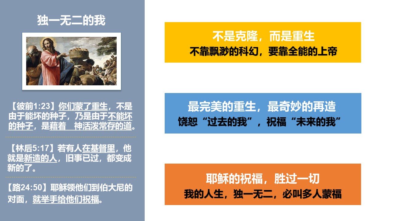 感谢你,你如此顾念我,你知道我对“我是谁,我真的是不可替代的,还是随时可以被替代的”这个问题的困惑,你知道,我渴心灵深处最深的渴望和最大的需求,所以你赐下这篇信息帮助我。 我 (你的名字)愿意做出我人生中最重要、也是最明智的抉择——接受你的独生爱子耶稣基督的救赎,借着基督,让我获得重生的新生命,不是克隆另一个我,不是找一个克隆体代替我,而是让我的生命本质,发生真正的改变和升华, 天父,感谢你让我认识到自己是全宇宙中“独一无二”的存在,无可替代,因为在你的心目当中,我就是无可替代的。 我 (你的名字)愿意接受主基督的救恩,愿主耶稣带领我,让我真正胜过死亡,因为你说过“信耶稣的,就是出死入生的”。 我也愿意把自己的一切软弱过犯,都交给耶稣,愿主把这些我生命中的重担都拿走,让我接下来的人生都可以卸下重担,喜乐奔跑。 阿爸父啊,求你祝福我 (你的名字),在我接下来的人生中,总是能“与过去的自己,和解”,总是对“我的未来,充满盼望”。 我 (你的名字)承认,我还有很多软弱和迷茫,还有很多要成长的地方,求天父怜恤我,让我开始谦卑学习你的《圣经》,能明白更多福音真理,求你为我安排合适的基督教会,让我能在圣徒的群体中,越来越认识你的生命之道,让我的灵魂就越发的强壮。 我 (你的名字)承认,在我接下来的人生历程中,必然还有软弱跌倒的时候,求你按照你的信实和慈爱,总是伸手搀扶我,让我总是能走出“自我身份认识的迷茫和低谷”,总是重新走回到你的美善义路上。 最重要的,求阿爸父上帝你祝福我 (你的名字),让我能更深地认识耶稣基督的福音,让我能成为见证基督的人,帮助更多人归向基督,荣耀你的圣名。 如此感恩、祷告和祈求,是奉耶稣的圣名,阿们!